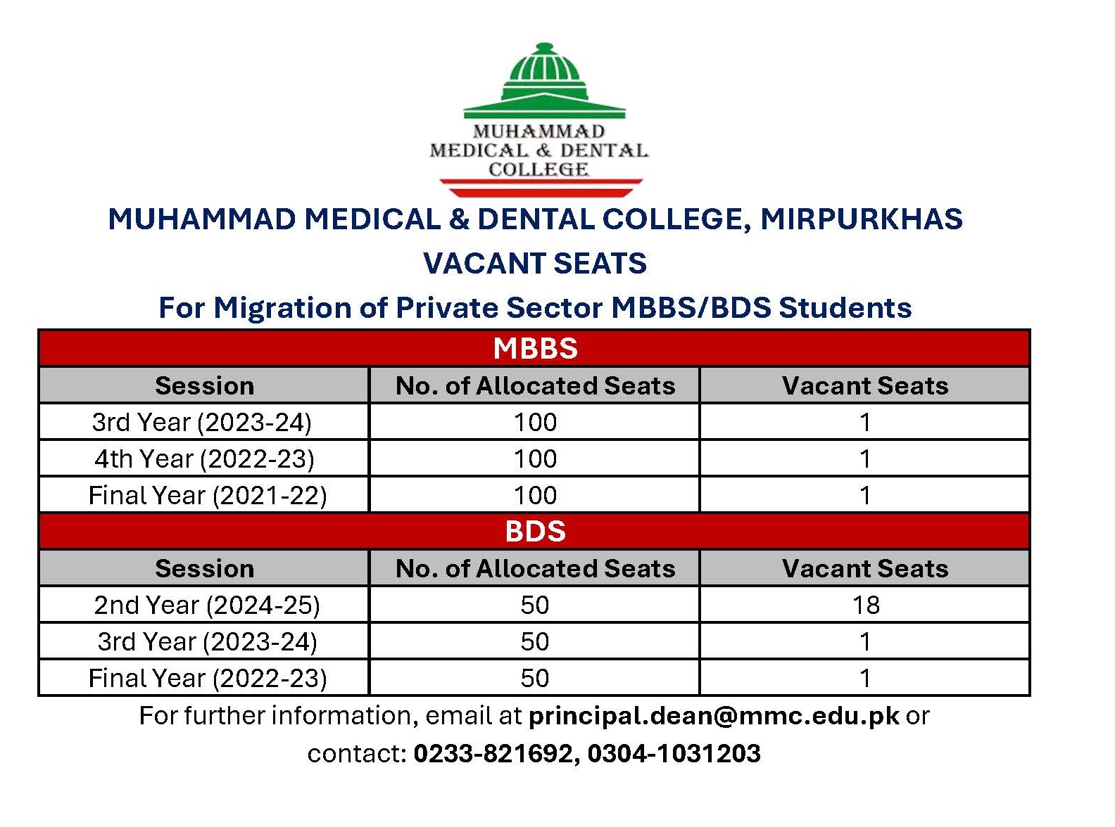 Ibn-e-Sina University is located just outside Mirpurkhas (6 km from Zero point) on Hyderabad road. This is opposite Ratanabad Railway station near main bus stand. Itspreads over 40 acresowned by Muhammad Foundation Trust for its projects. All necessary facilities including building, gas, electricity, telephone, e-mail. Internet, transport, accommodation, food and drink spots are available. Public transport operating along Hyderabad road provides frequent and regular access to the University. The University building is more than sufficient to the requirement and has all the necessary departments. Each department has its own museum, laboratory and tutorial room, which are well equipped and fascinating. All facilities are modern and up-to the mark. Students get clinical training in nearby 500 bedded Muhammad Medical college Hospital. There are hostels for boys and girls onsite andin the city. A new large state of art 3 stories girls'hostelhas just been established onsite