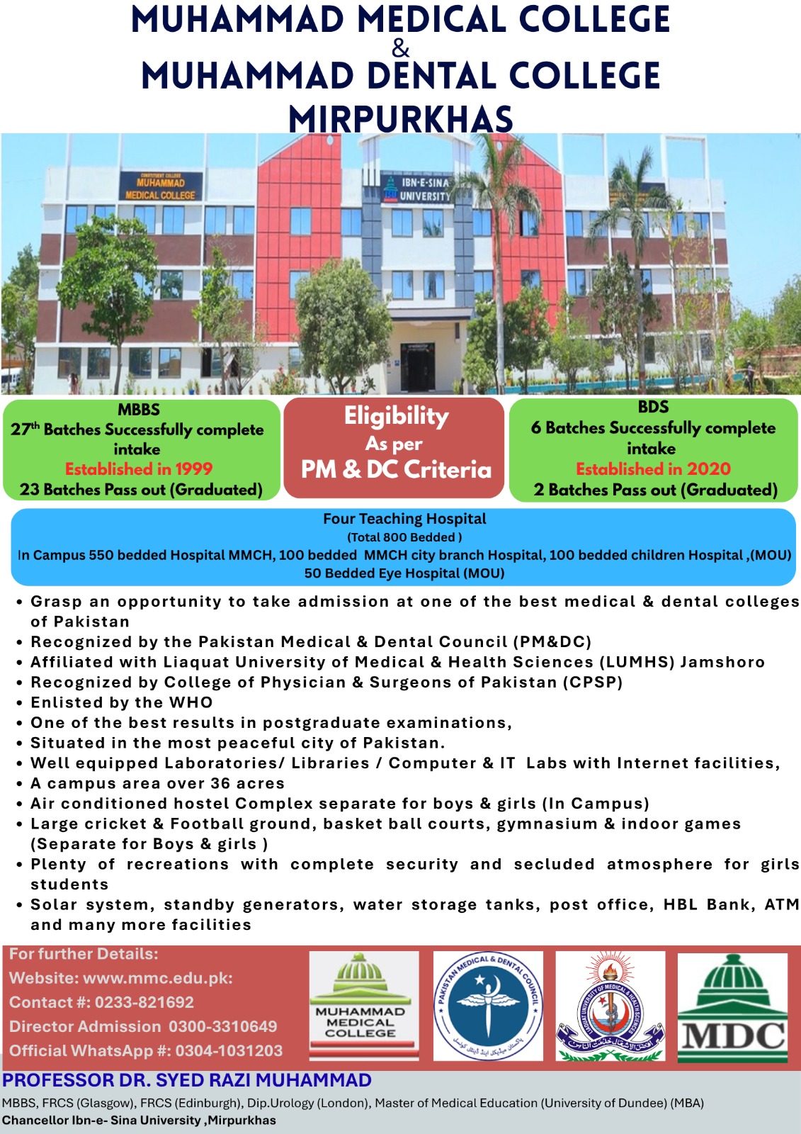 Ibn-e-Sina University is located just outside Mirpurkhas (6 km from Zero point) on Hyderabad road. This is opposite Ratanabad Railway station near main bus stand. Itspreads over 40 acresowned by Muhammad Foundation Trust for its projects. All necessary facilities including building, gas, electricity, telephone, e-mail. Internet, transport, accommodation, food and drink spots are available. Public transport operating along Hyderabad road provides frequent and regular access to the University. The University building is more than sufficient to the requirement and has all the necessary departments. Each department has its own museum, laboratory and tutorial room, which are well equipped and fascinating. All facilities are modern and up-to the mark. Students get clinical training in nearby 500 bedded Muhammad Medical college Hospital. There are hostels for boys and girls onsite andin the city. A new large state of art 3 stories girls'hostelhas just been established onsite