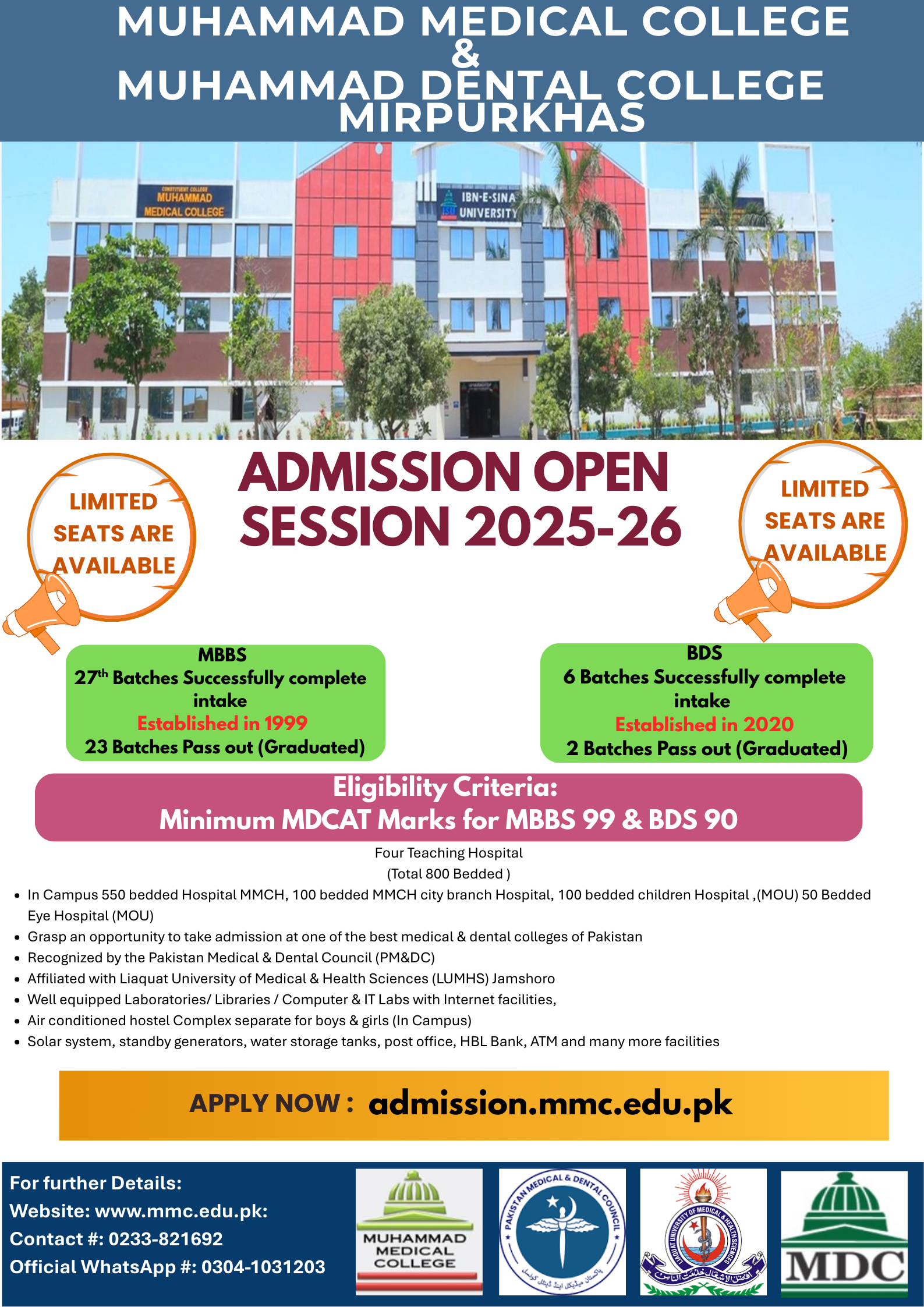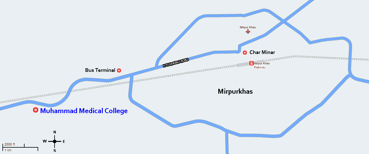 Ibn-e-Sina University is located just outside Mirpurkhas (6 km from Zero point) on Hyderabad road. This is opposite Ratanabad Railway station near main bus stand. Itspreads over 40 acresowned by Muhammad Foundation Trust for its projects. All necessary facilities including building, gas, electricity, telephone, e-mail. Internet, transport, accommodation, food and drink spots are available. Public transport operating along Hyderabad road provides frequent and regular access to the University. The University building is more than sufficient to the requirement and has all the necessary departments. Each department has its own museum, laboratory and tutorial room, which are well equipped and fascinating. All facilities are modern and up-to the mark. Students get clinical training in nearby 500 bedded Muhammad Medical college Hospital. There are hostels for boys and girls onsite andin the city. A new large state of art 3 stories girls'hostelhas just been established onsite